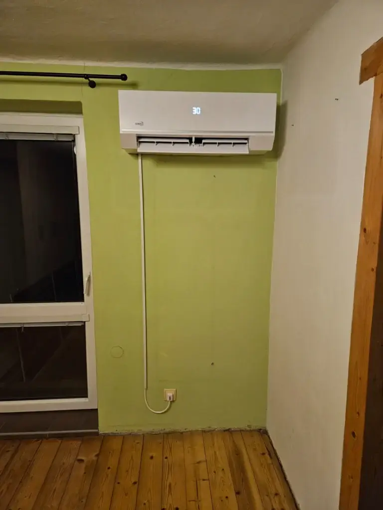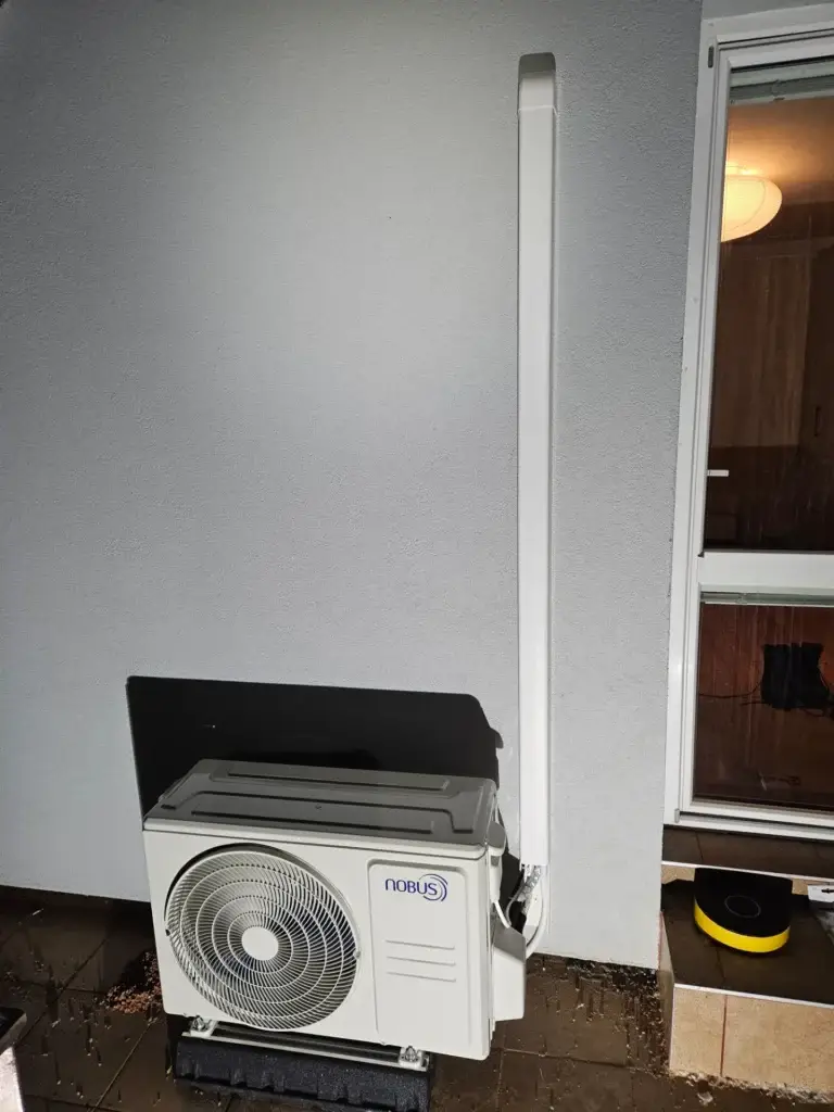 Součástí realizace byla kompletní montáž split klimatizace, propojení vnitřní a venkovní jednotky chladivovým potrubím, odvod kondenzátu a napojení na elektroinstalaci. Důraz byl kladen na pevné kotvení do obvodové konstrukce, správné vyspádování potrubí a čisté vedení kabeláže podél fasády. Po dokončení instalace proběhla tlaková zkouška, vakuování systému a uvedení klimatizace do provozu.