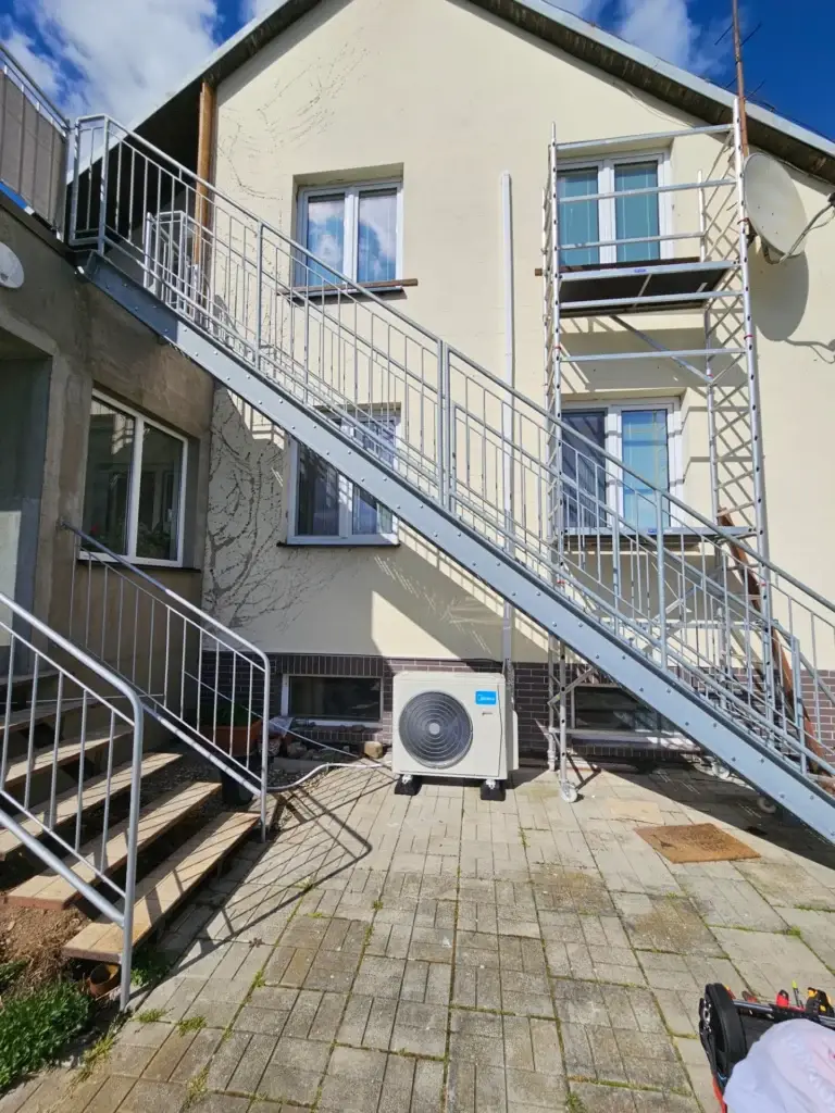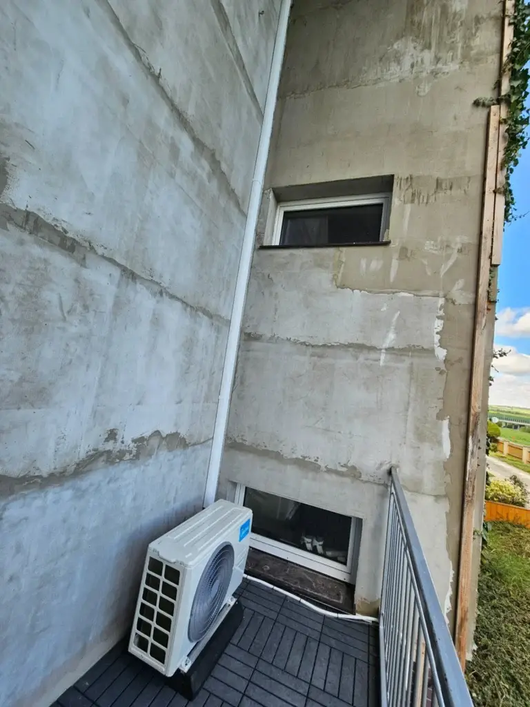 Montáž klimatizace pro klienta v obci Pustějov realizovaná na bytovém domě s důrazem na bezpečné umístění venkovní jednotky a technicky čisté provedení instalace. Venkovní jednotka byla osazena na zpevněný podklad u objektu tak, aby bylo zajištěno stabilní usazení, dostatečné proudění vzduchu a snadný přístup pro budoucí servis klimatizace. Umístění bylo navrženo s ohledem na dispoziční řešení budovy a minimalizaci hluku pro okolní prostory.